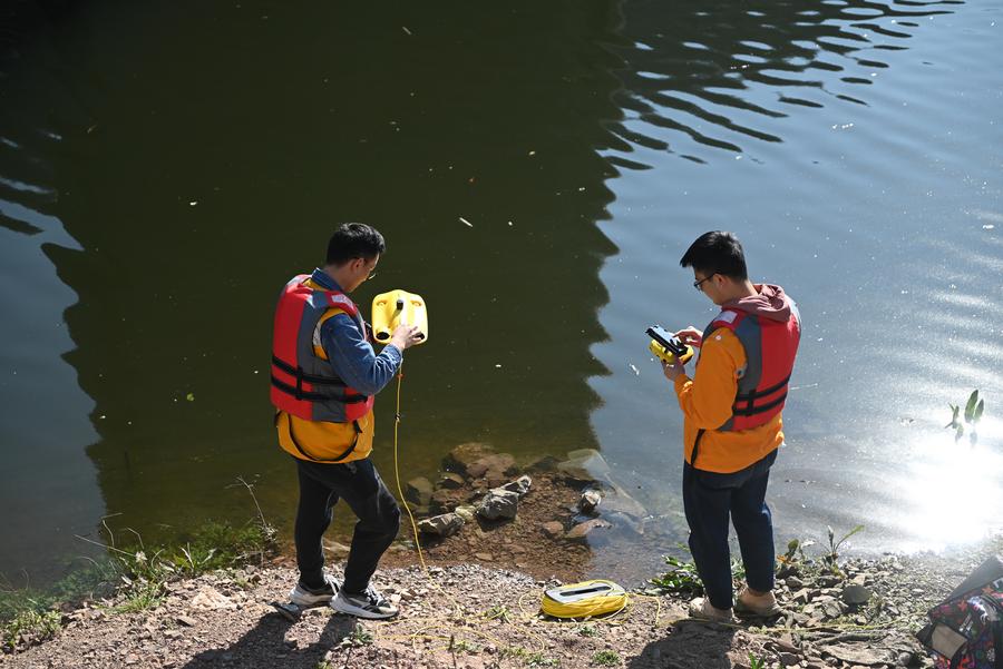 Technicians prepare unmanned submersibles for checking piers of a bridge of Chengdu-Guiyang High-Speed Railway in Guiyang, southwest China's Guizhou Province, Feb. 19, 2024. (Xinhua/Liu Xu)