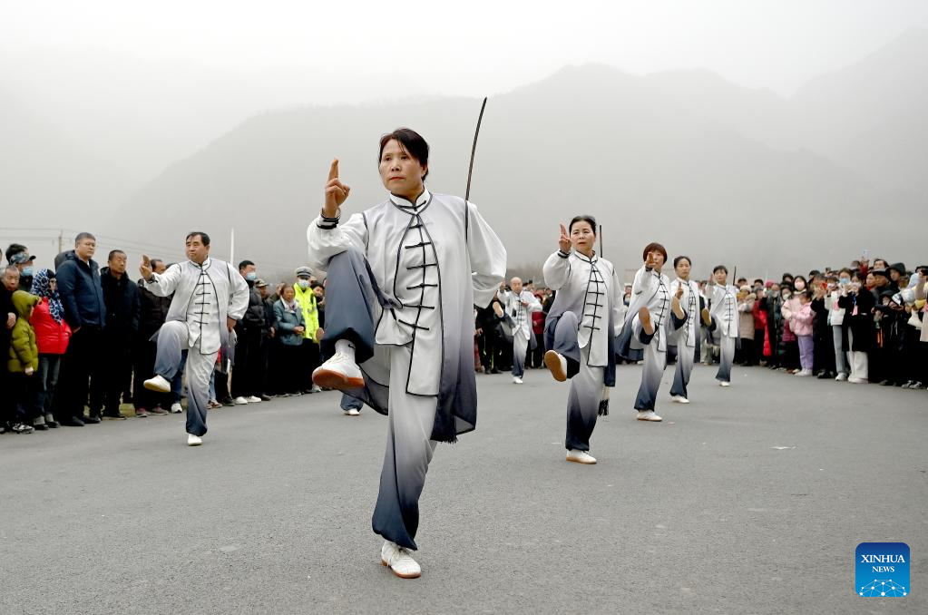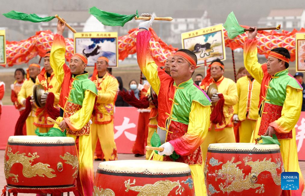 Drum dancers perform in Huyi District, Xi'an of northwest China's Shaanxi Province, Feb. 18, 2024. (Xinhua/Liu Xiao)