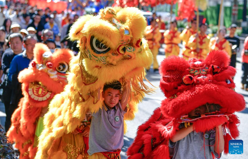 People perform lion dance during a Chinese Lunar New Year celebration event in Longli County, southwest China's Guizhou Province, Feb. 18, 2024. (Xinhua/Yang Wenbin)