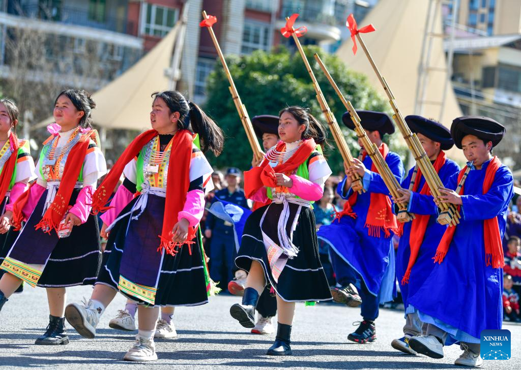 People dance while playing Lusheng, a reed-pipe wind instrument, during a Chinese Lunar New Year celebration event in Longli County, southwest China's Guizhou Province, Feb. 18, 2024. (Xinhua/Yang Wenbin)