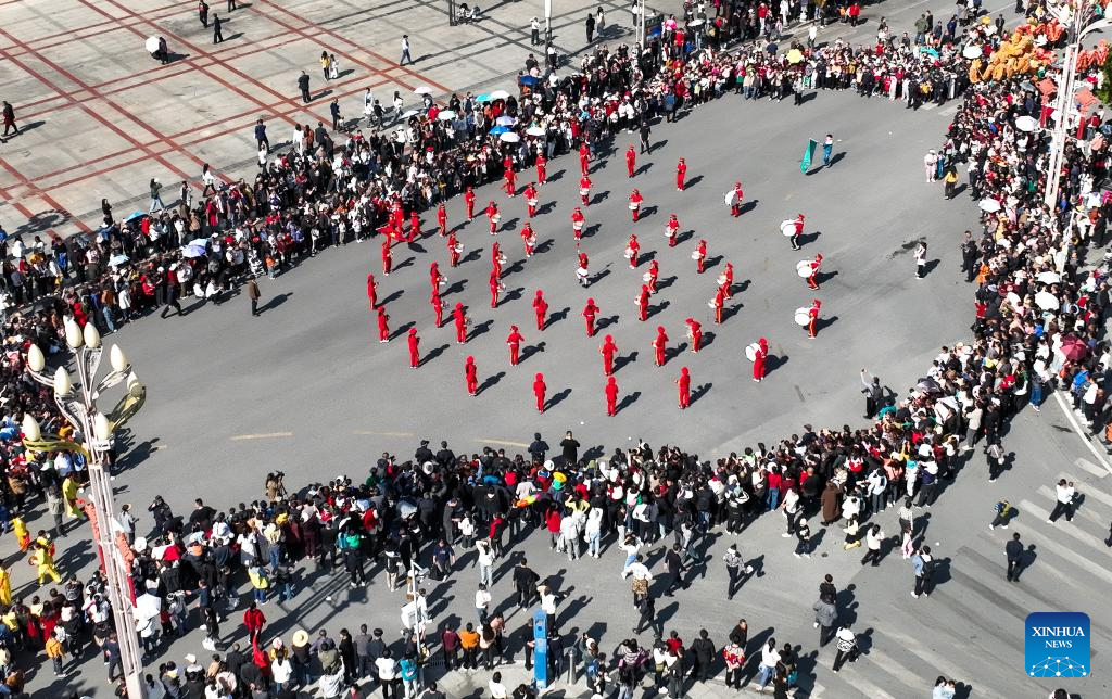 An aerial drone photo shows a Chinese Lunar New Year celebration event in Longli County, southwest China's Guizhou Province, Feb. 18, 2024. (Xinhua/Yang Wenbin)