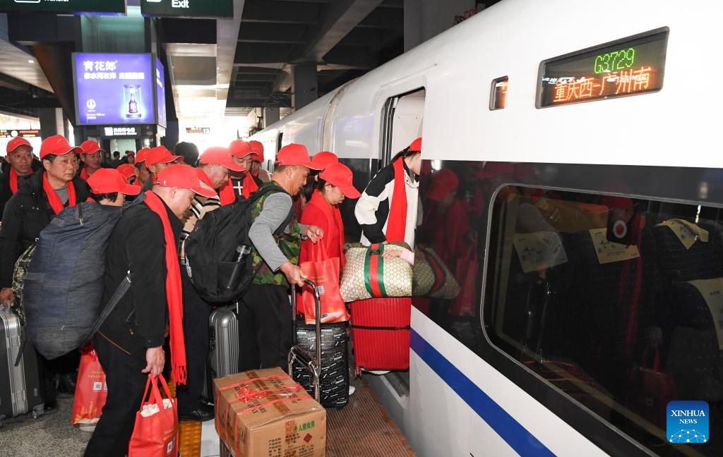 Migrant workers board train G3729 at Chongqing West Railway Station in southwest China's Chongqing Municipality, Feb. 19, 2024. Train G3729, a chartered train for migrant workers who are about to return to work, left Chongqing West Railway Station here on Monday and headed towards Guangzhou South Railway Station. It is the first train of its kind that departed from Chongqing after the Spring Festival holiday this year. Over 300 migrant workers from Chongqing and southwest China's Sichuan Province took the train. (Xinhua/Wang Quanchao)