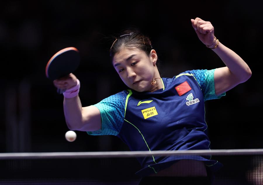 Chen Meng of China competes against Dora Madarasz of Hungary during the women's team Group 1 match at the ITTF World Team Table Tennis Championships Finals, Feb. 19, 2024. (Xinhua/Yang Shiyao)