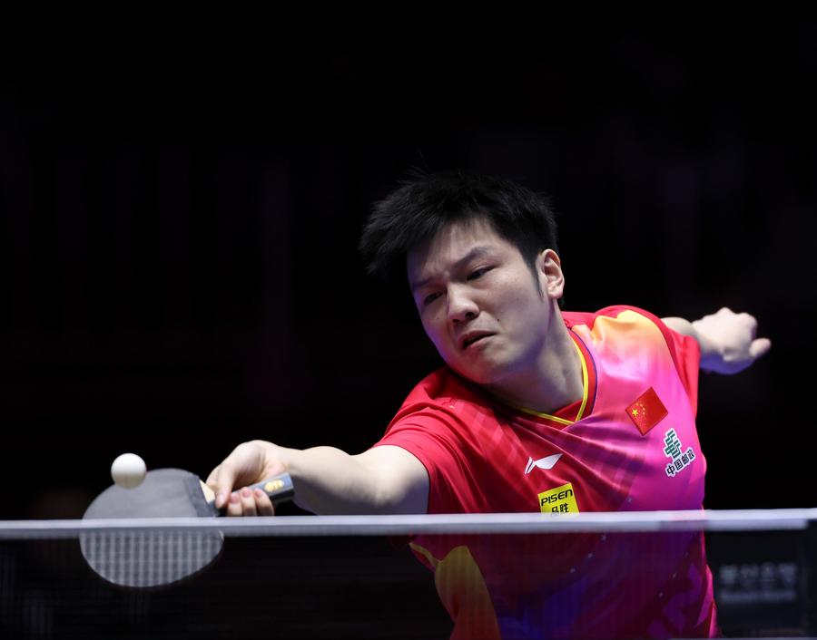 Fan Zhendong of China competes against Tomislav Pucar of Croatia during the men's team Group 1 match at the ITTF World Team Table Tennis Championships Finals in Busan, South Korea, Feb. 19, 2024. (Xinhua/Yao Qilin)