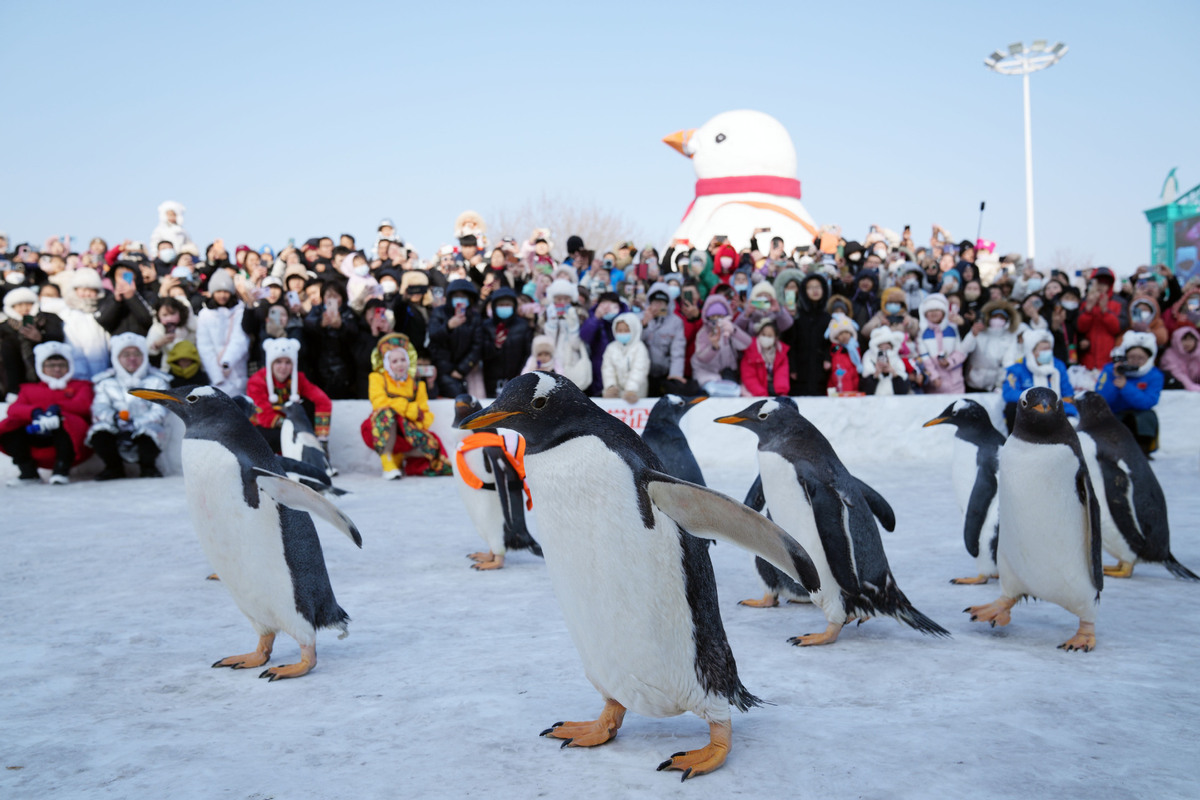 Tourists watch a parade of penguins at the Harbin Polarpark in Harbin, Northeast China's Heilongjiang province, Feb 13, 2024. [Photo/Xinhua]