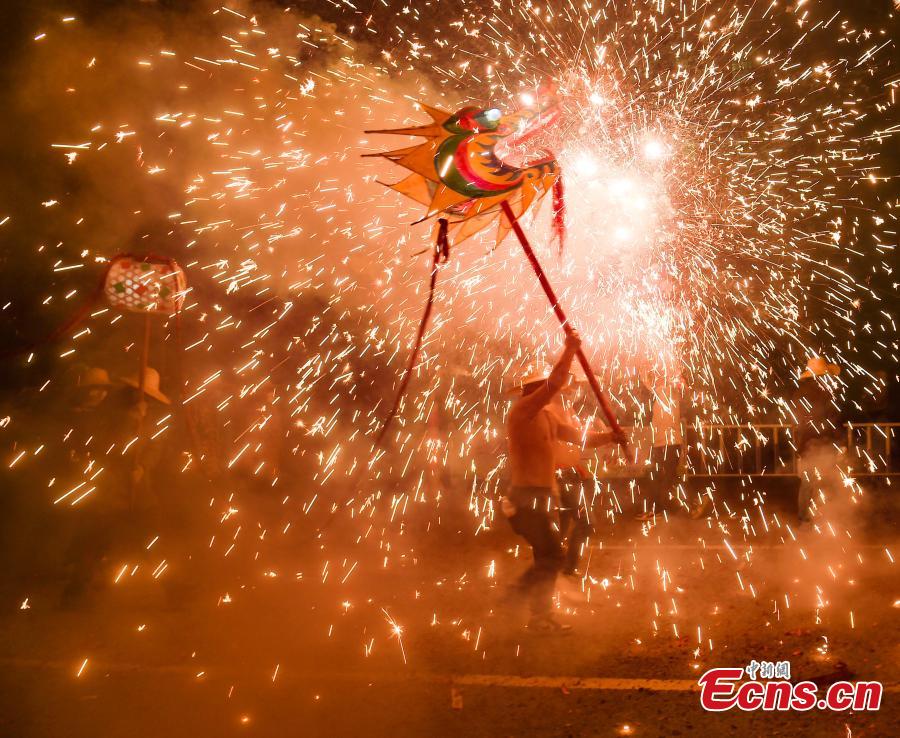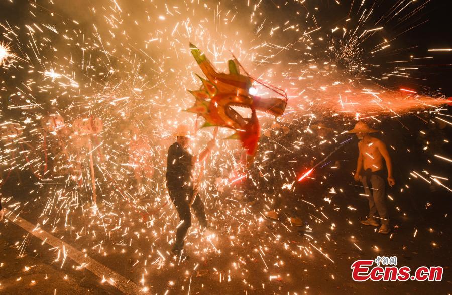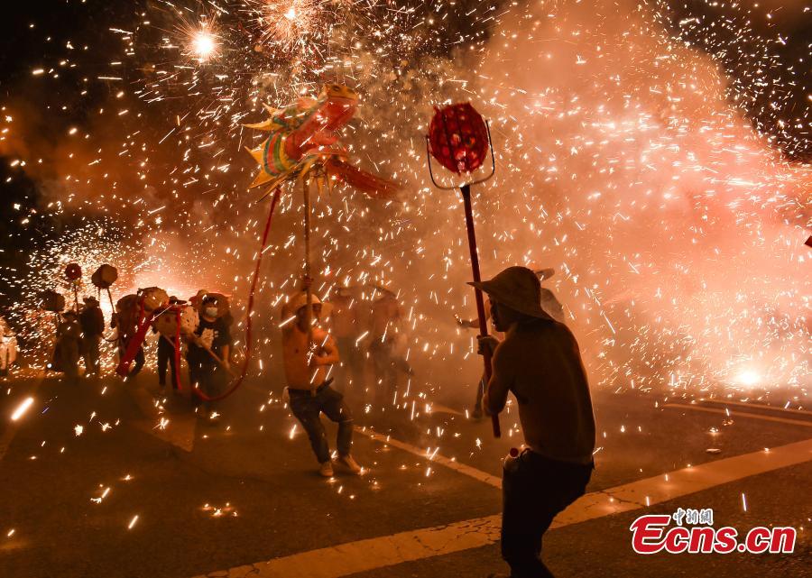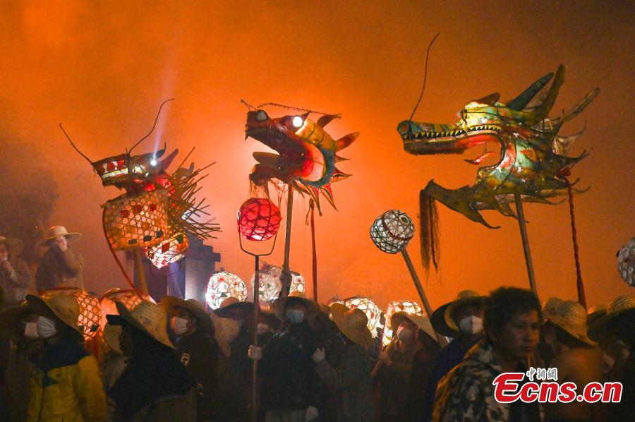 People perform dragon dance amid fireworks to celebrate the Chinese New Year in Mengxi Town, Songtao Miao Autonomous County of Tongren City, southwest China's Guizhou Province, Feb. 18, 2024. (Photo: China News Service/Xie Huifang)