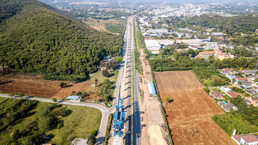 This aerial photo taken on Feb. 23, 2023 shows a construction site of the China-Thailand railway in Nakhon Ratchasima province, Thailand. (Xinhua/Wang Teng)