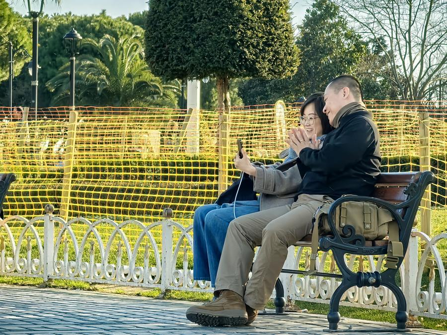 Two Chinese tourists sit on a bench at the historical Sultanahmet Square in Istanbul, Türkiye, Feb. 9, 2024. (Photo by Safar Rajabov/Xinhua)