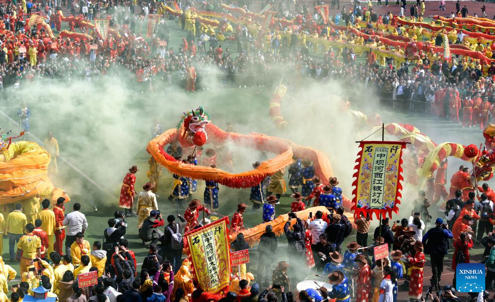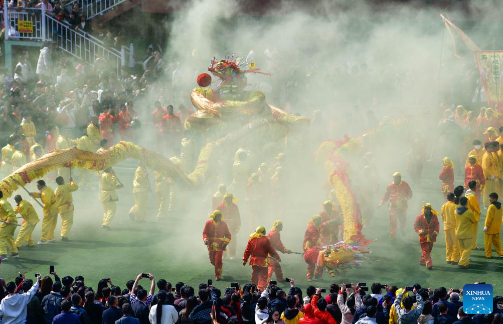 People watch a dragon dance competing event during the "Maolong Festival" of Gelao ethnic group in Shiqian County, southwest China's Guizhou Province, Feb. 20, 2024. The festival, as a folk activity for people of the Gelao ethnic group to celebrate the Spring Festival and lantern festival, is listed as one of the national intangible cultural heritages in 2006. (Xinhua/Yang Wenbin)