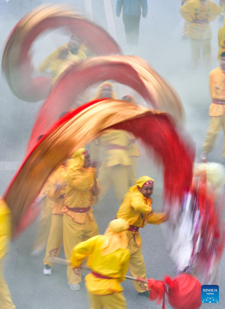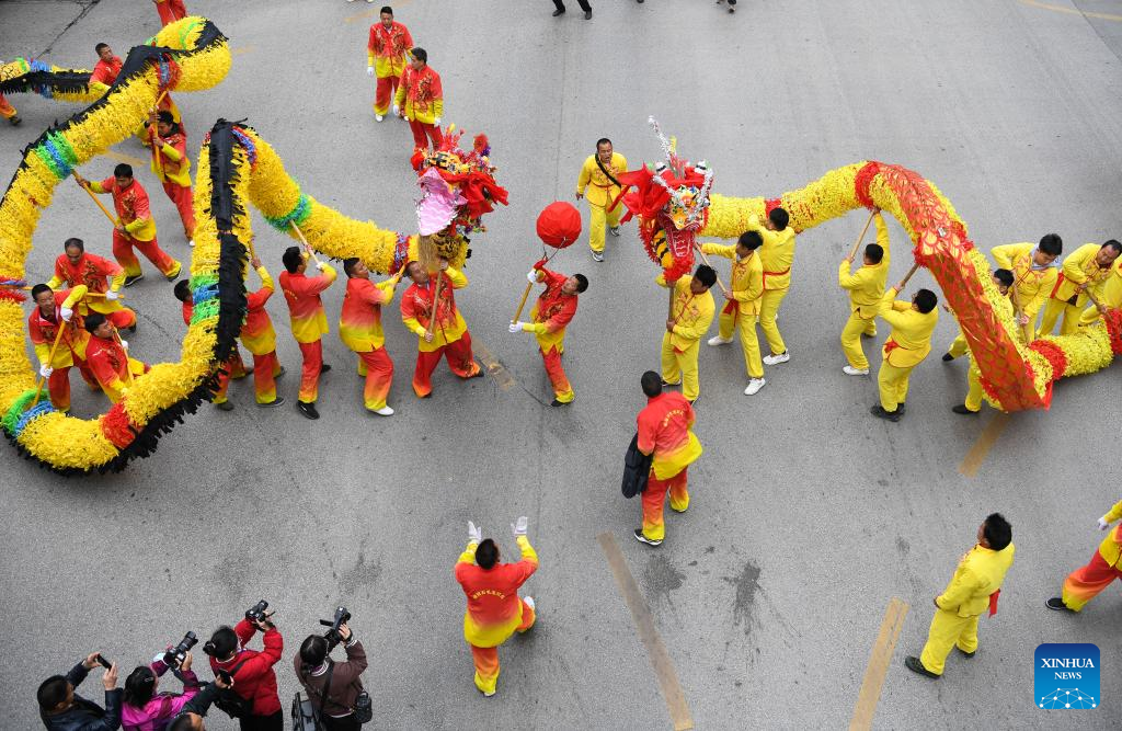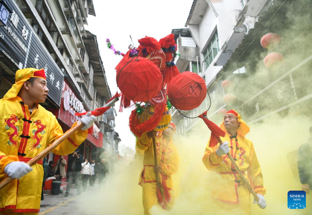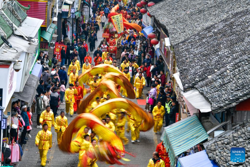Local people perform dragon dance during the "Maolong Festival" of Gelao ethnic group in Shiqian County, southwest China's Guizhou Province, Feb. 20, 2024. The festival, as a folk activity for people of the Gelao ethnic group to celebrate the Spring Festival and lantern festival, is listed as one of the national intangible cultural heritages in 2006. (Xinhua/Yang Wenbin)