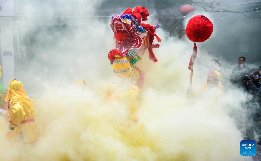 A dragon dance performance is staged during the "Maolong Festival" of Gelao ethnic group in Shiqian County, southwest China's Guizhou Province, Feb. 20, 2024. The festival, as a folk activity for people of the Gelao ethnic group to celebrate the Spring Festival and lantern festival, is listed as one of the national intangible cultural heritages in 2006. (Xinhua/Yang Wenbin)