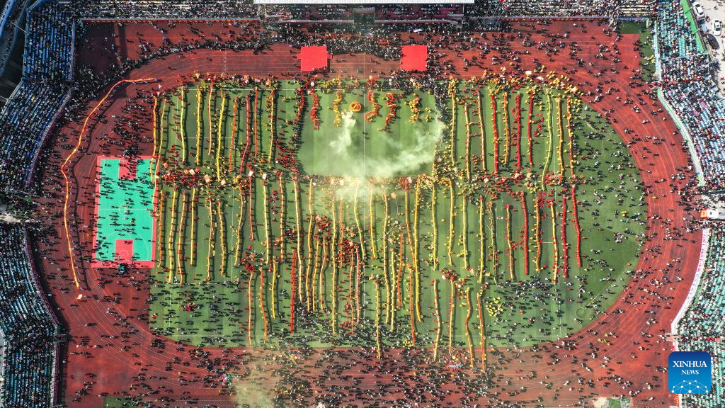 An aerial drone photo shows a view of the "Maolong Festival" of Gelao ethnic group in Shiqian County, southwest China's Guizhou Province, Feb. 20, 2024. The festival, as a folk activity for people of the Gelao ethnic group to celebrate the Spring Festival and lantern festival, is listed as one of the national intangible cultural heritages in 2006. (Xinhua/Yang Wenbin)