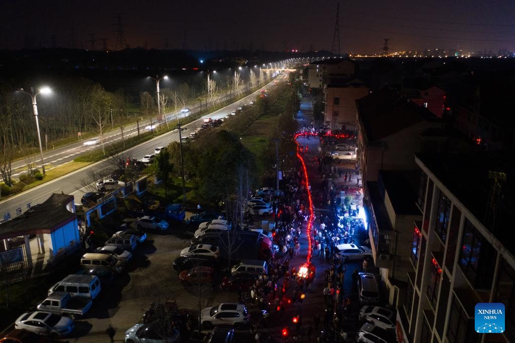 An aerial drone photo taken on Feb. 19, 2024 shows villagers performing lantern dragon dance in Lixin Village of Jinhua City, east China's Zhejiang Province. As the Lantern Festival approaches, villagers perform lantern dragon dance for good fortune and happiness. (Xinhua/Xu Yu)