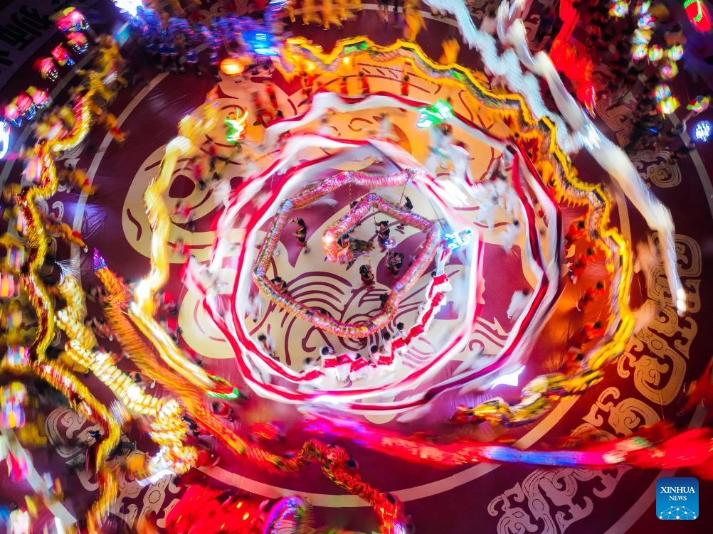 Actors give a dragon dance performance in celebration of the upcoming Lantern Festival in Sancha Township of Bozhou District in Zunyi City, southwest China's Guizhou Province, Feb. 20, 2024. As the Lantern Festival is approaching, traditional dragon dance performances are staged across the country in full festive atmosphere. (Photo by Li Renjun/Xinhua)
