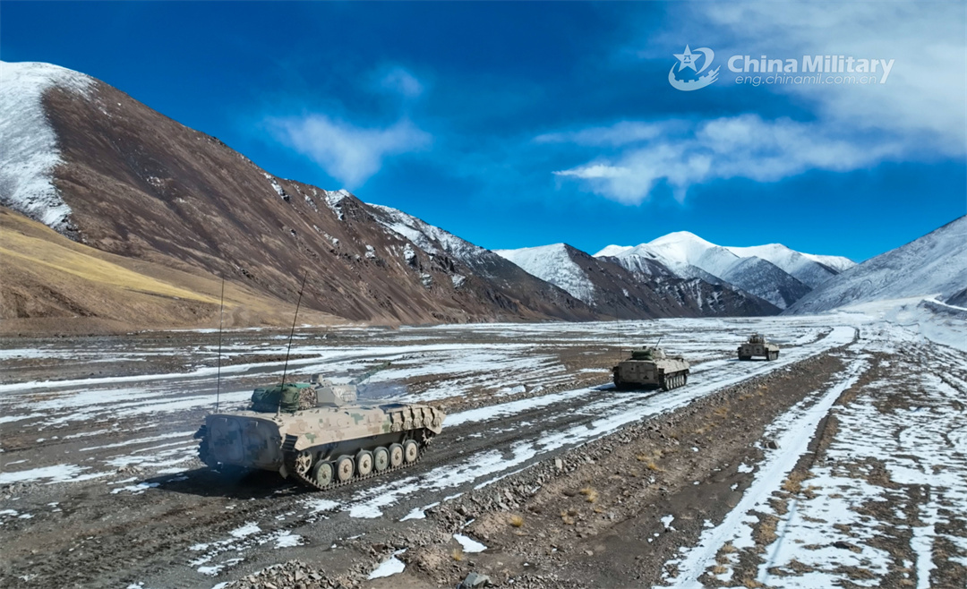 Armored vehicles attached to a regiment under the PLA Xinjiang Military Command march in formation during a maneuver training exercise on January 27, 2024. (eng.chinamil.com.cn/Photo by Liu Tao)