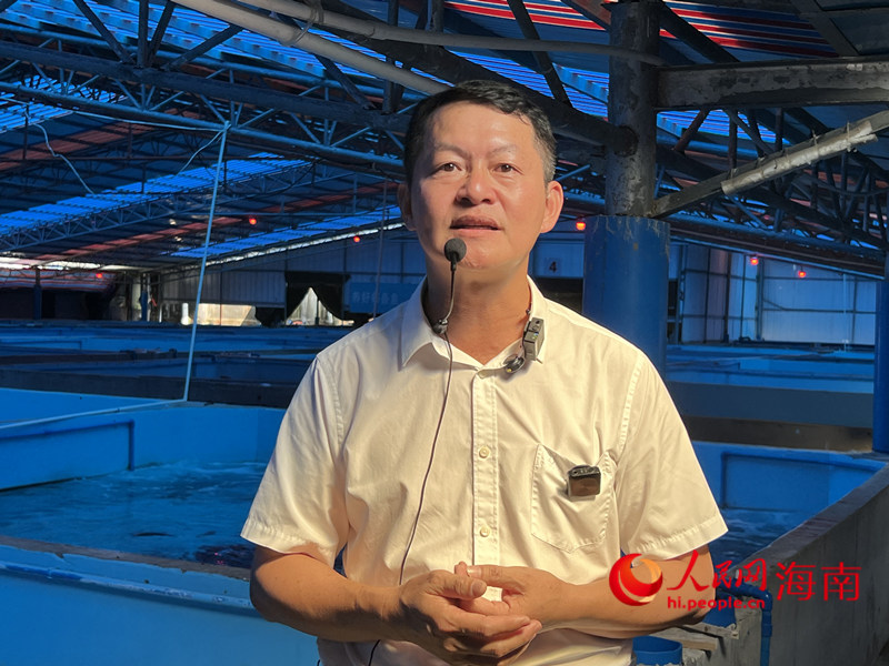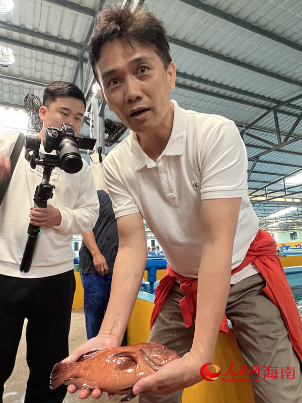 Ye Huiqiang, head of the Wanning mariculture association, introduces the breeding situation of leopard coral groupers. (People's Daily Online/Li Xueshan)