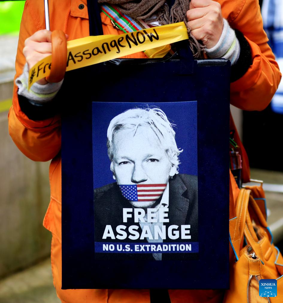 A sign showing support for WikiLeaks founder Julian Assange is seen in a protest outside the United Kingdom (UK) High Court in London, Britain, on Feb. 21, 2024. (Xinhua/Li Ying)