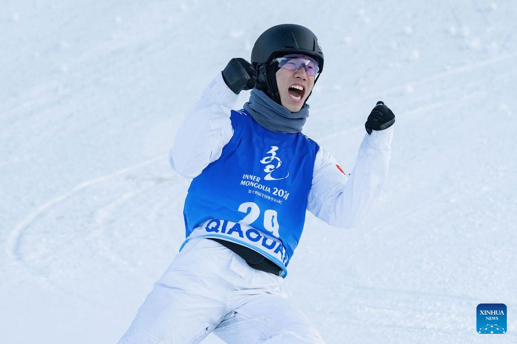 Chen Shuo of Henan celebrates during the men's aerials competition at the 14th National Winter Games in Hulun Buir, north China's Inner Mongolia Autonomous Region, Feb. 21, 2024. (Xinhua/Xie Jianfei)