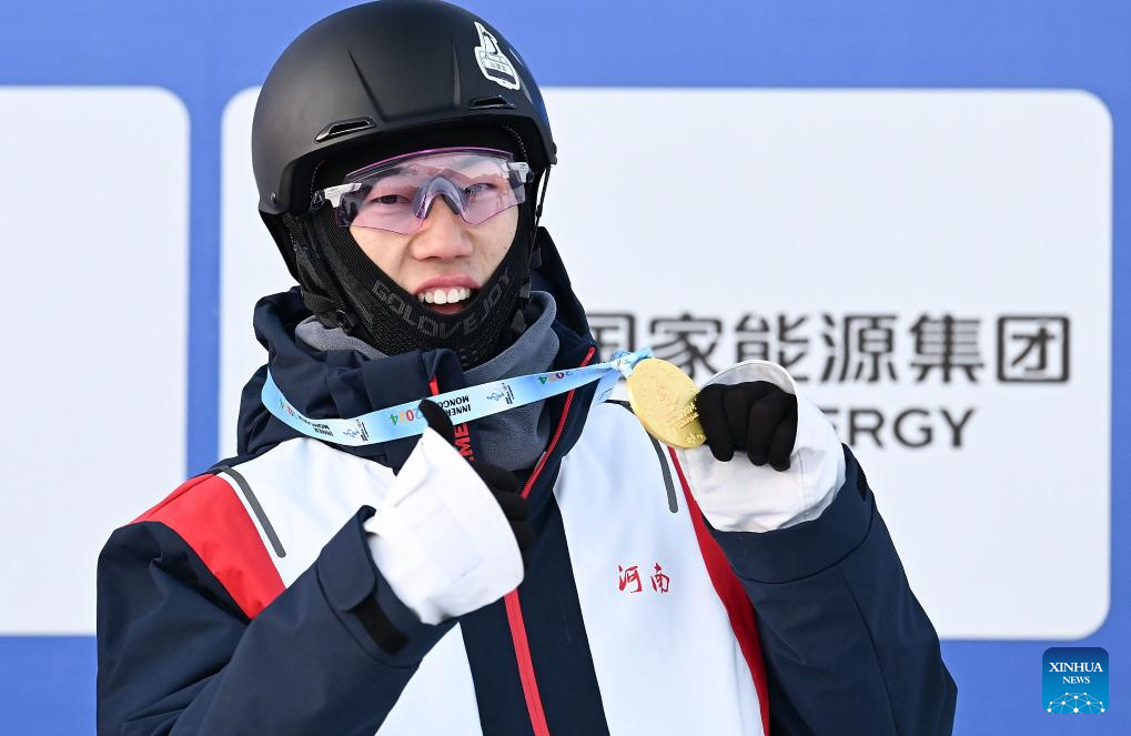 Gold medalist Chen Shuo of Henan celebrates at the awarding ceremony for the men's aerials competition at the 14th National Winter Games in Hulun Buir, north China's Inner Mongolia Autonomous Region, Feb. 21, 2024. (Xinhua/Yang Guanyu)