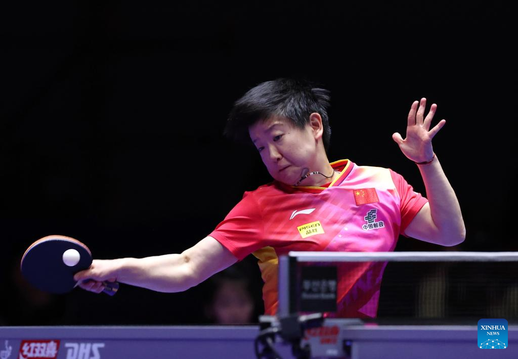 Suthasini Sawettabut of Thailand competes against Chen Meng of China during the women's team round of 16 match between China and Thailand at the ITTF World Team Table Tennis Championships Finals Busan 2024 in Busan, South Korea, Feb. 21, 2024. (Xinhua/Yang Shiyao)