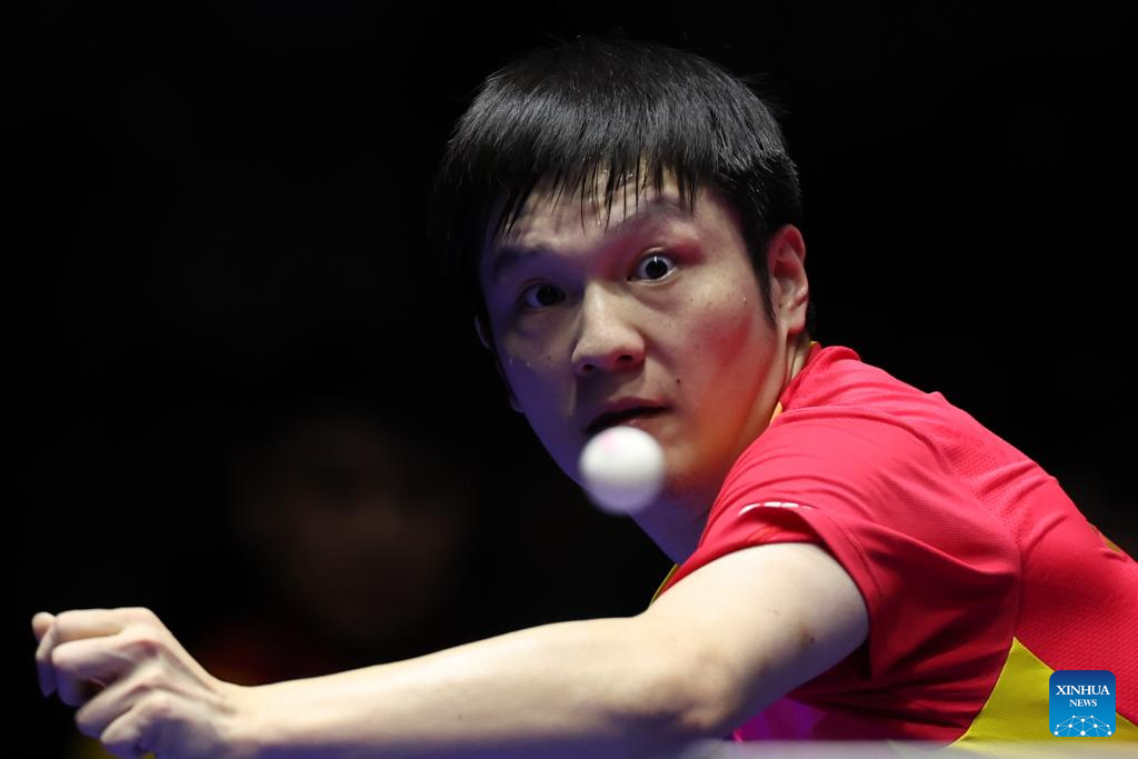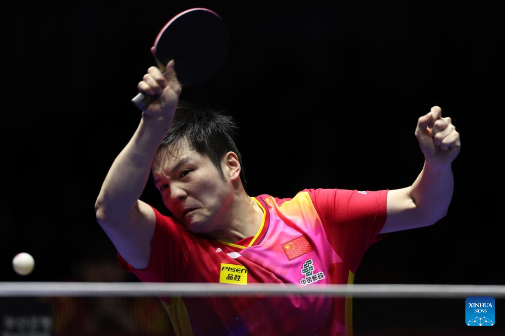 Fan Zhendong of China competes against Eduard Ionescu of Romania during the men's team round of 16 match at the ITTF World Team Table Tennis Championships Finals Busan 2024 in Busan, South Korea, Feb. 21, 2024. (Xinhua/Zhang Tao)