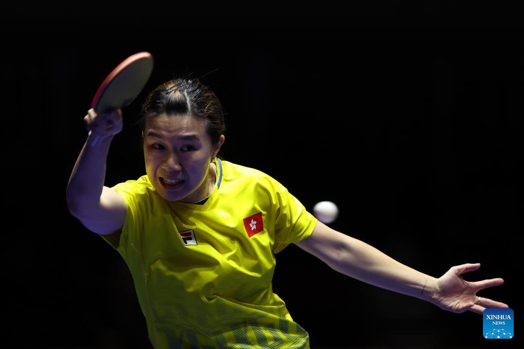 Lee Ho Ching of China's Hong Kong competes against Zuzanna Wielgos of Poland during the women's team round of 16 match at the ITTF World Team Table Tennis Championships Finals Busan 2024 in Busan, South Korea, Feb. 21, 2024. (Xinhua/Zhang Tao)