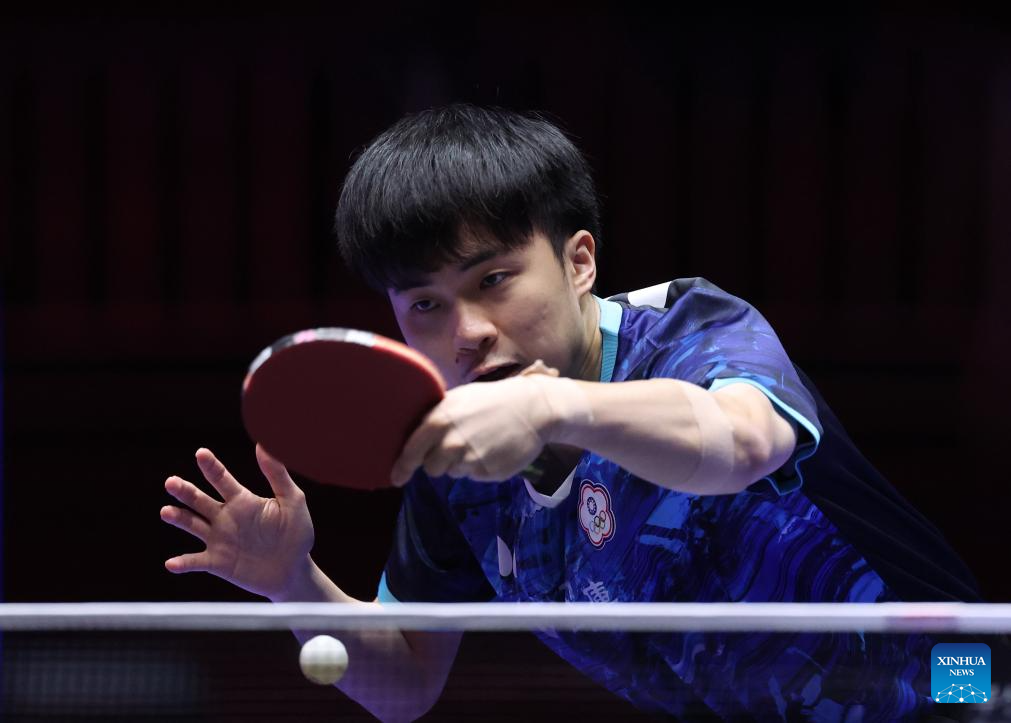 Kao Cheng-Jui of Chinese Taipei competes against Marko Jevtovic of Serbia during the men's team round of 32 match between Chinese Taipei and Serbia at the ITTF World Team Table Tennis Championships Finals Busan 2024 in Busan, South Korea, Feb. 21, 2024. (Xinhua/Yang Shiyao)