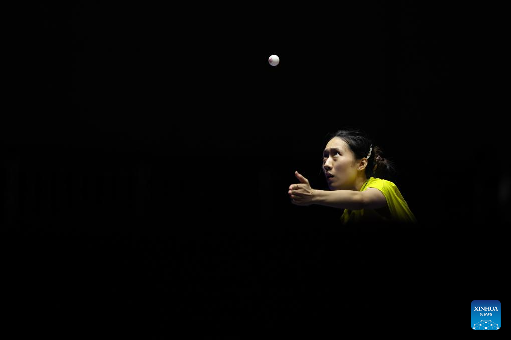 Wang Yidi of China competes against Orawan Paranang of Thailand during the women's team round of 16 match between China and Thailand at the ITTF World Team Table Tennis Championships Finals Busan 2024 in Busan, South Korea, Feb. 21, 2024. (Xinhua/Yang Shiyao)