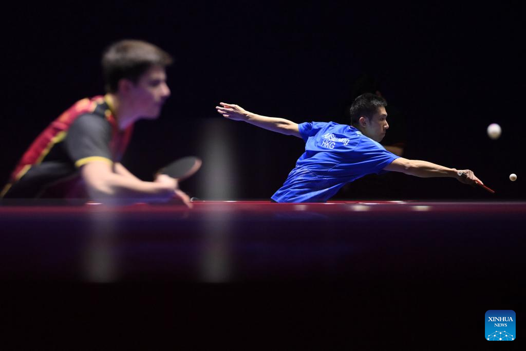Wong Chun Ting of China's Hong Kong competes against Andreas Levenko of Austria during the men's team round of 32 match between China's Hong Kong and Austria at the ITTF World Team Table Tennis Championships Finals Busan 2024 in Busan, South Korea, Feb. 21, 2024. (Xinhua/Tao Xiyi)