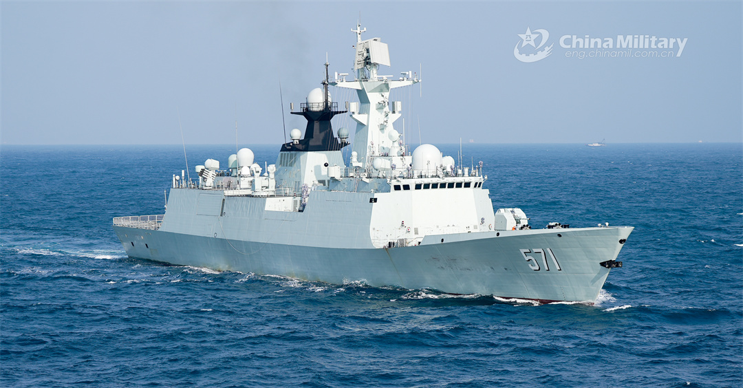 A guided-missile frigate attached to a naval flotilla under the PLA Southern Theater Command sails towards the designated waters during a training exercise in late January, 2024. (eng.chinamil.com.cn/Photo by Jiang Haitao)