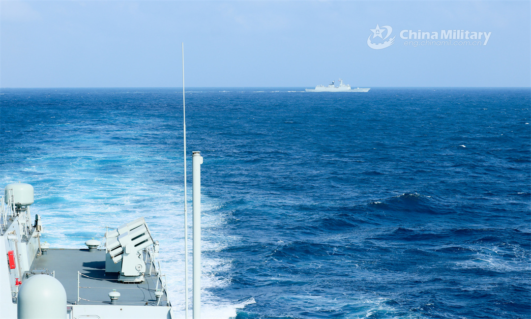 Naval vessels attached to a flotilla under the PLA Southern Theater Command sail towards the designated waters during a training exercise in late January, 2024. (eng.chinamil.com.cn/Photo by Jiang Haitao)