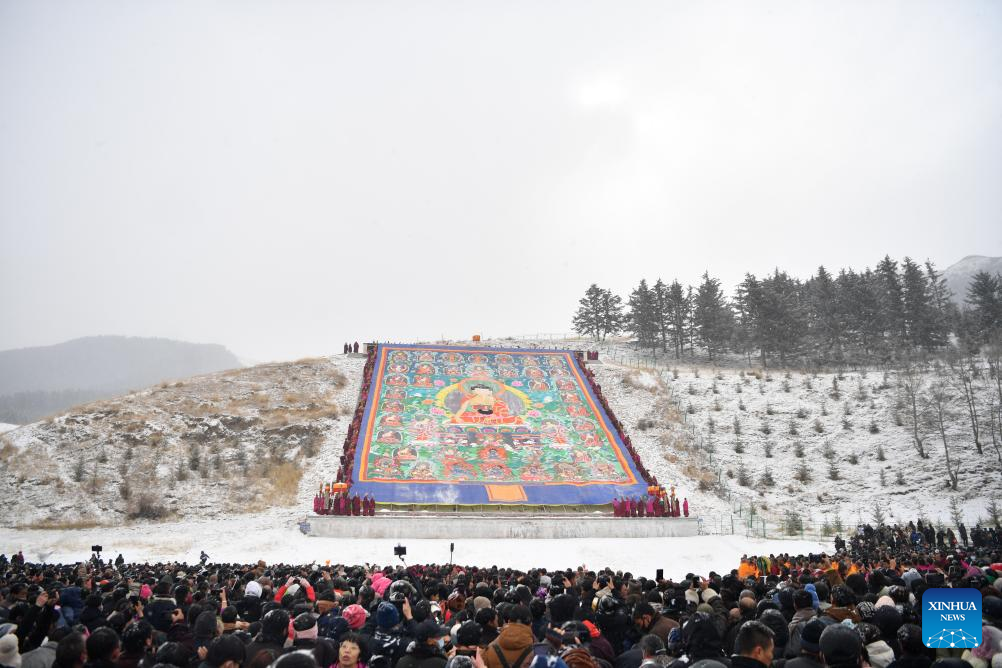 This photo taken on Feb. 22, 2024 shows a scene of the annual "sunning of the Buddha" ceremony of Labrang Monastery in Xiahe County, northwest China's Gansu Province. (Xinhua/Fang Xin)