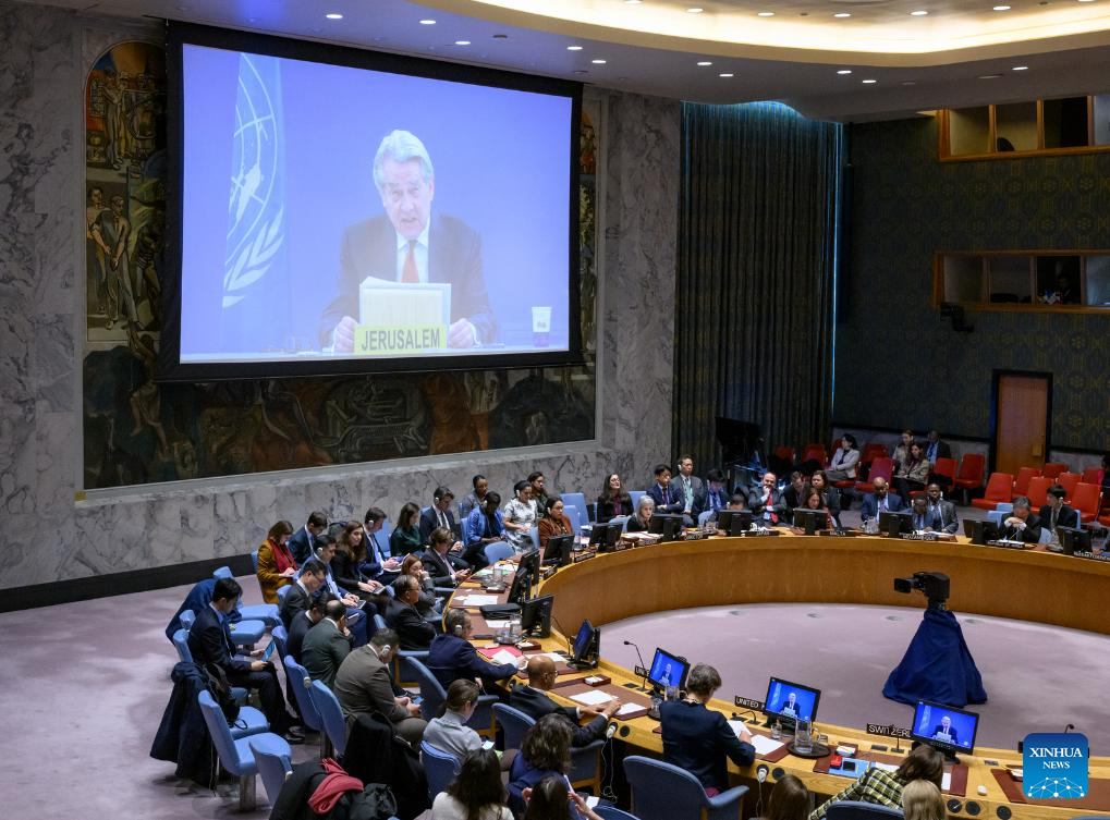 UN Special Coordinator for the Middle East Peace Process Tor Wennesland (on screens) speaks via a video link at a Security Council meeting at the UN Headquarters in New York, on Feb. 22, 2024. Wennesland on Thursday called for collective efforts to restore a political horizon for Palestinians and Israelis. (Loey Felipe/UN Photo/Handout via Xinhua)
