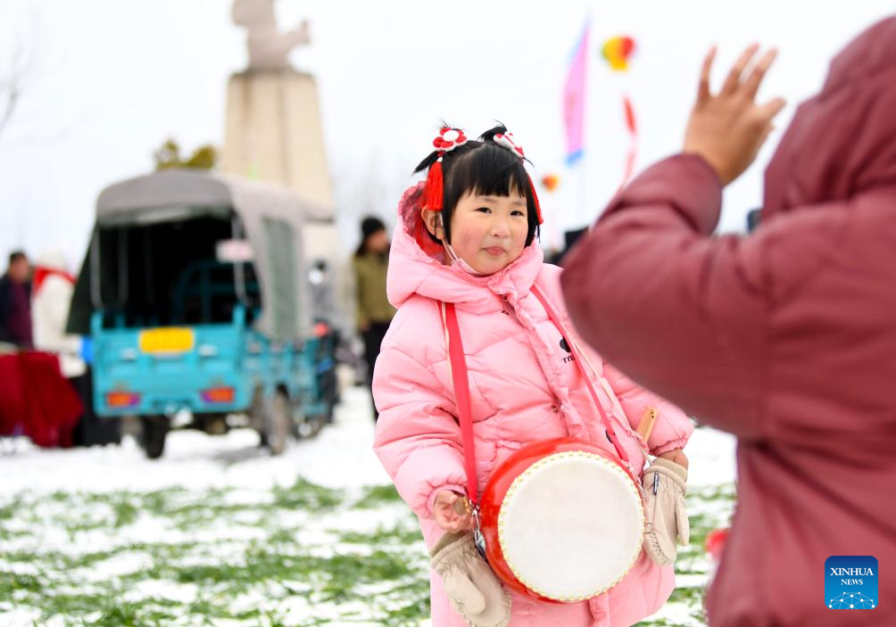 A girl poses for photos at the Quyi fair in Majie Village of Baofeng County, central China's Henan Province, Feb. 22, 2024. (Xinhua/Hao Yuan)