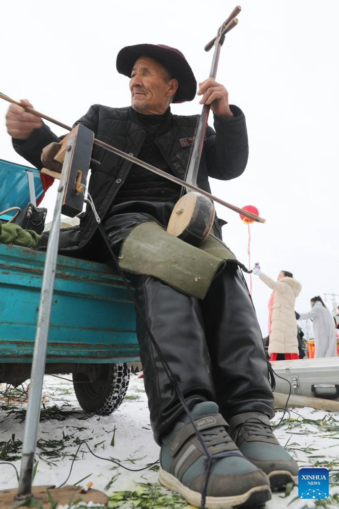 A folk artist performs during the Quyi fair in Majie Village of Baofeng County, central China's Henan Province, Feb. 22, 2024. (Xinhua/Hao Yuan)