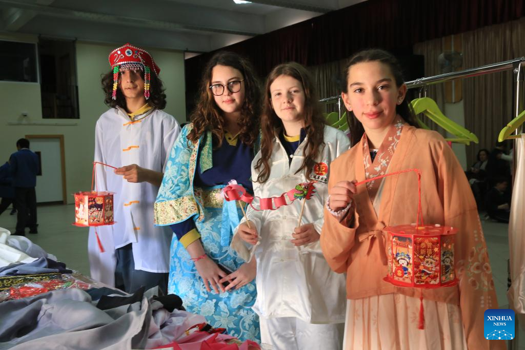 Students wearing traditional Chinese clothing pose for a group photo at a school in Pembroke, Malta, on Feb. 22, 2024. On Thursday, an event for the Chinese Lantern Festival was held at St. Clare Pembroke Secondary School, northeastern Malta, featuring singing and dancing, Chinese paper-cuts, tasting of dumplings, and trying on traditional Chinese clothing known as Hanfu. (Xinhua/Chen Wenxian)