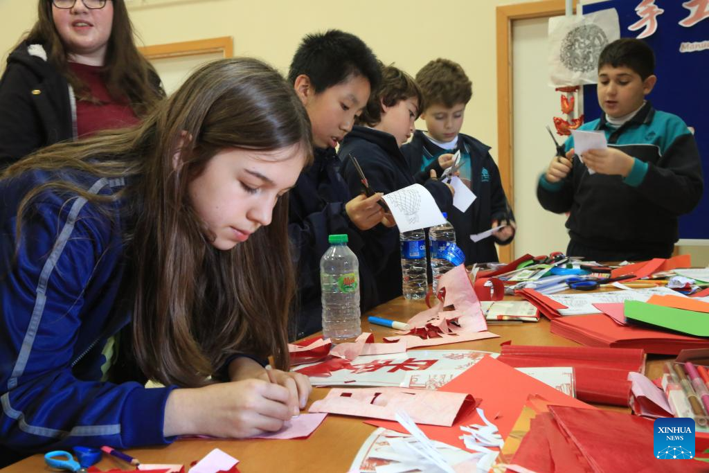 Students make Chinese paper-cuts at a school in Pembroke, Malta, on Feb. 22, 2024. On Thursday, an event for the Chinese Lantern Festival was held at St. Clare Pembroke Secondary School, northeastern Malta, featuring singing and dancing, Chinese paper-cuts, tasting of dumplings, and trying on traditional Chinese clothing known as Hanfu. (Xinhua/Chen Wenxian)