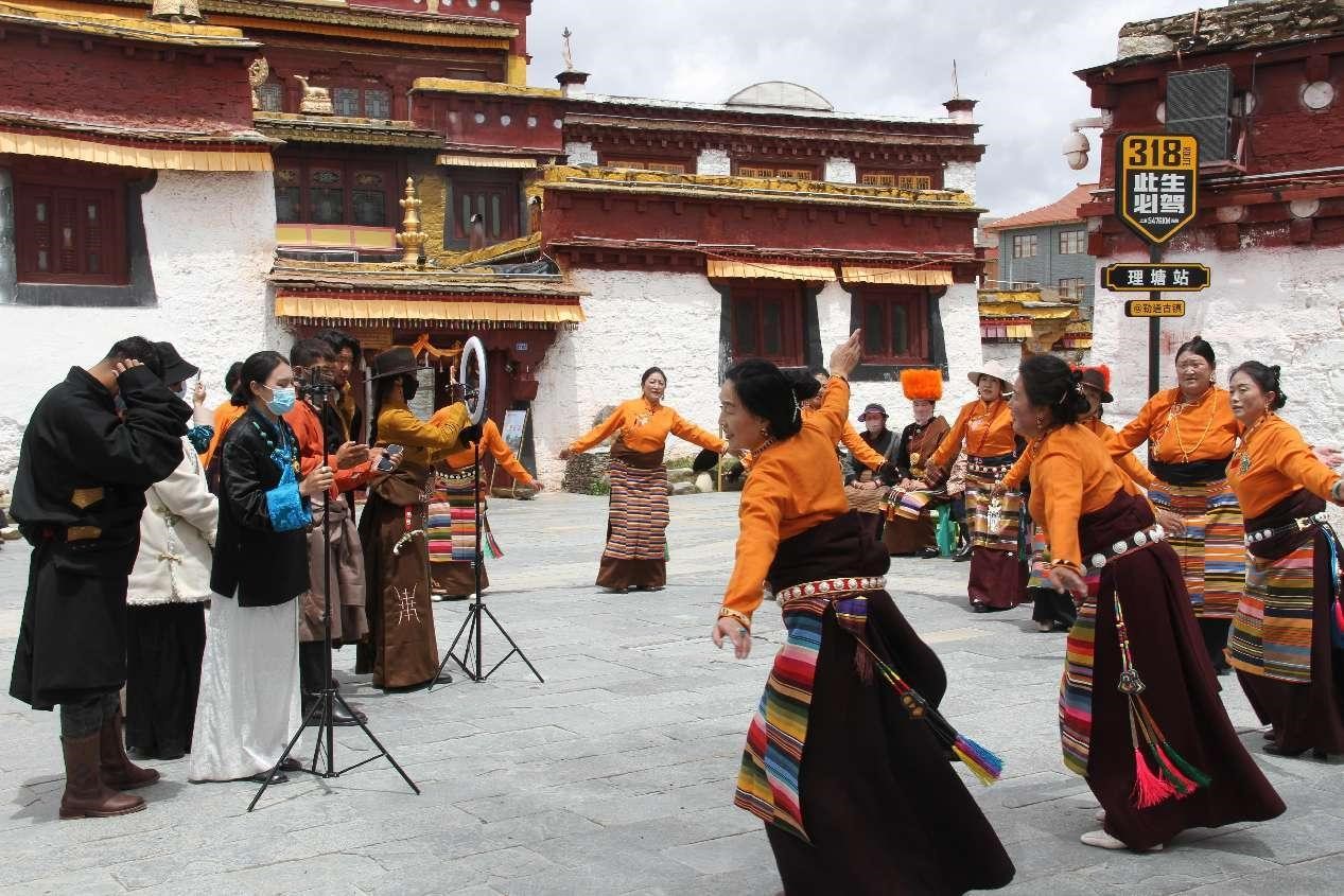 Folk dance is livestreamed by young streamers in Letong ancient town, Litang, Garze Tibetan autonomous prefecture, southwest China's Sichuan province. (People's Daily Online/Ye Qiangping)