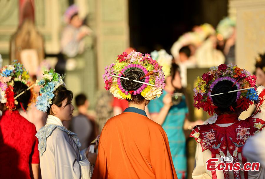The floral headdress, a traditional symbol of Xunpu women, is called Zanhuawei in Quanzhou, a port city known as one of the starting points of the ancient maritime silk road. The flowery headwear is made of fresh flowers and hairpins and was included in the second batch of national intangible cultural heritage in 2008.