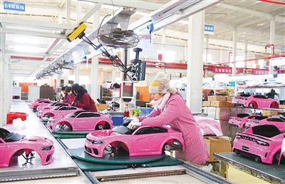 Workers assemble cars for children at the factory of a toy manufacturer in Xingtai, north China's Hebei Province. The products will be exported to the U.S. and Germany. (Photo/Zhao Yonghui)