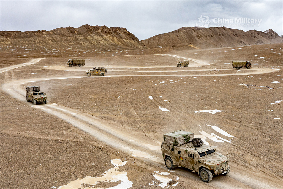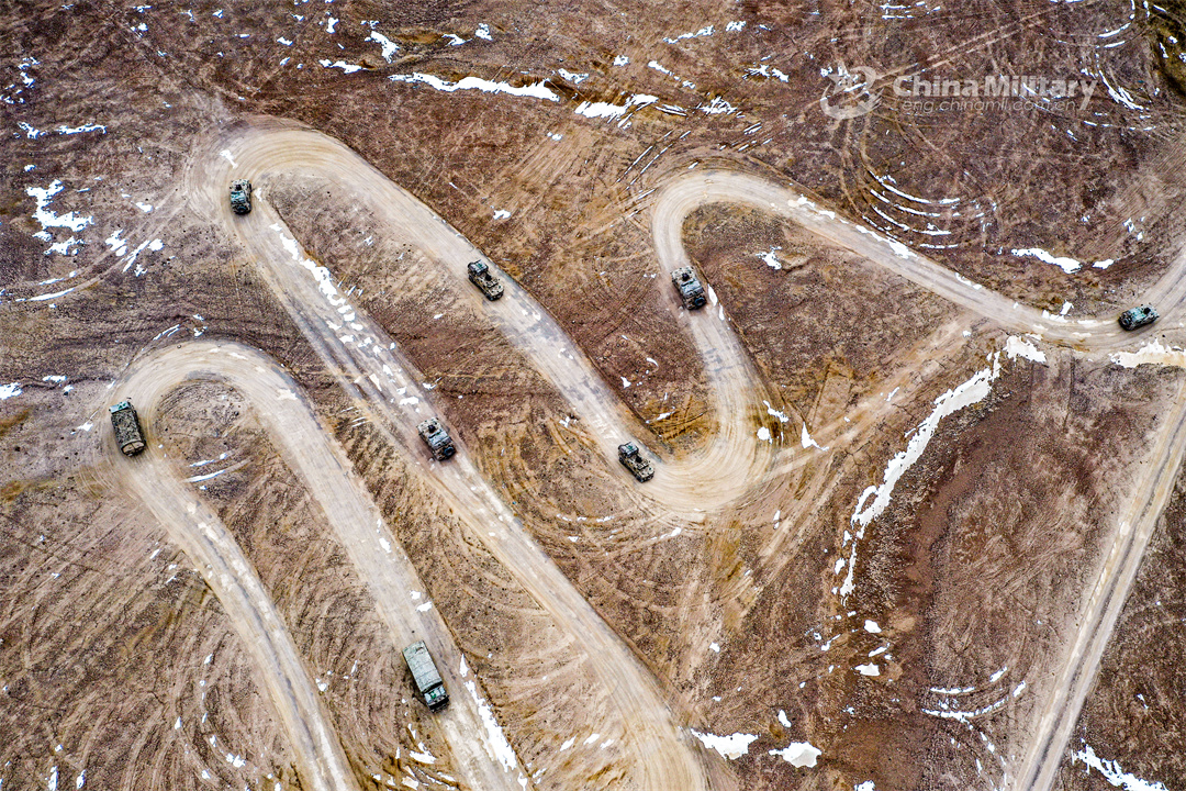A military truck convoy attached to a regiment under the PLA Xinjiang Military Command moves on a zigzag road in unfamiliar area during a driving skill training exercise in early February, 2024. (eng.chinamil.com.cn/Photo by Yang Qi)