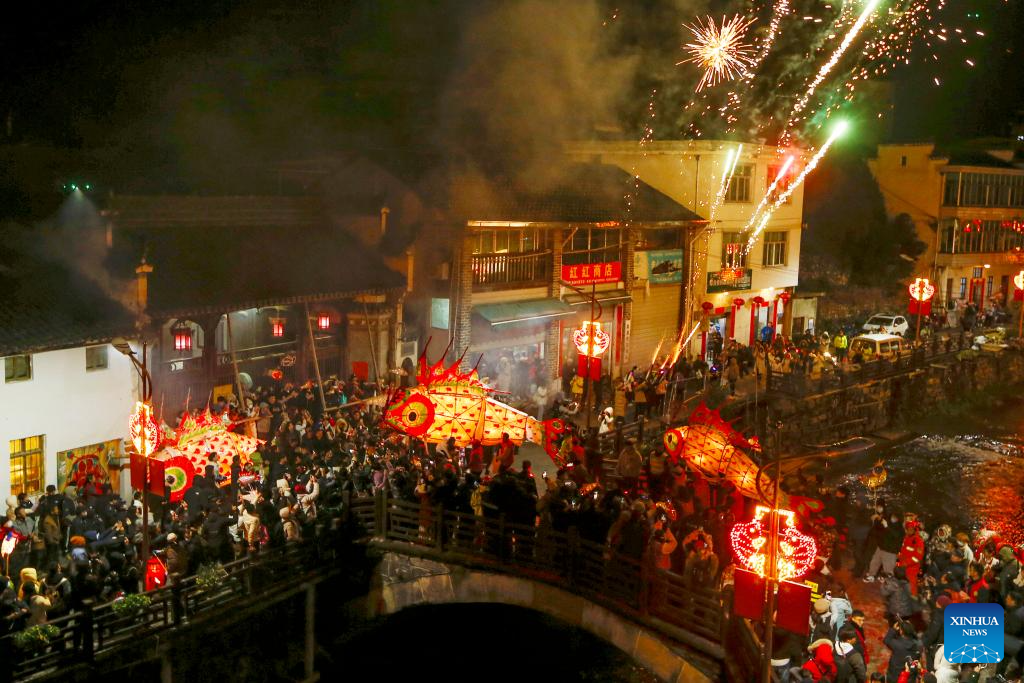 People watch an event celebrating the upcoming Chinese Lantern Festival in Hefu Town of Huzhou City, east China's Zhejiang Province, Feb. 23, 2024. (Xinhua/Huang Zongzhi)