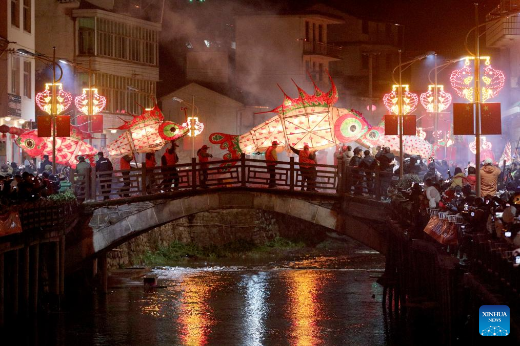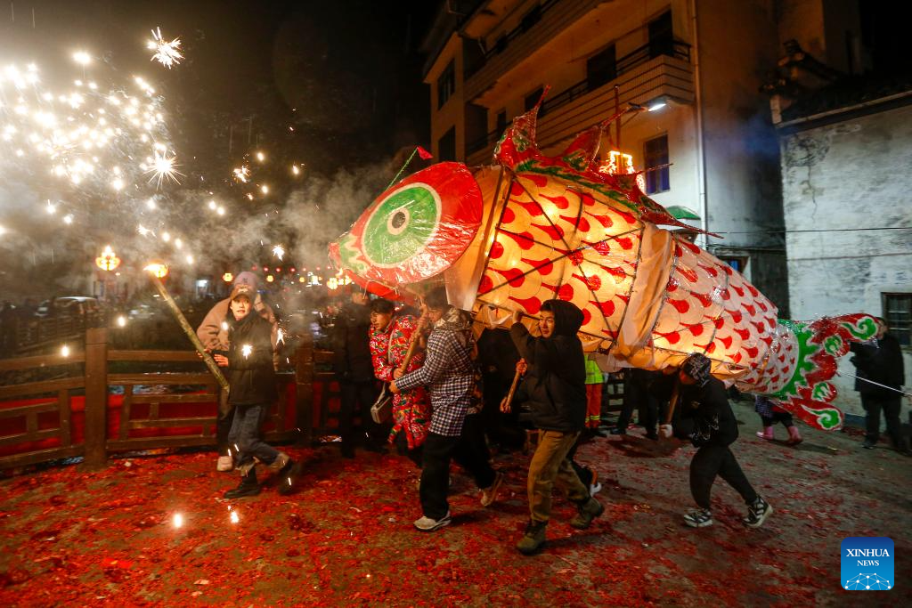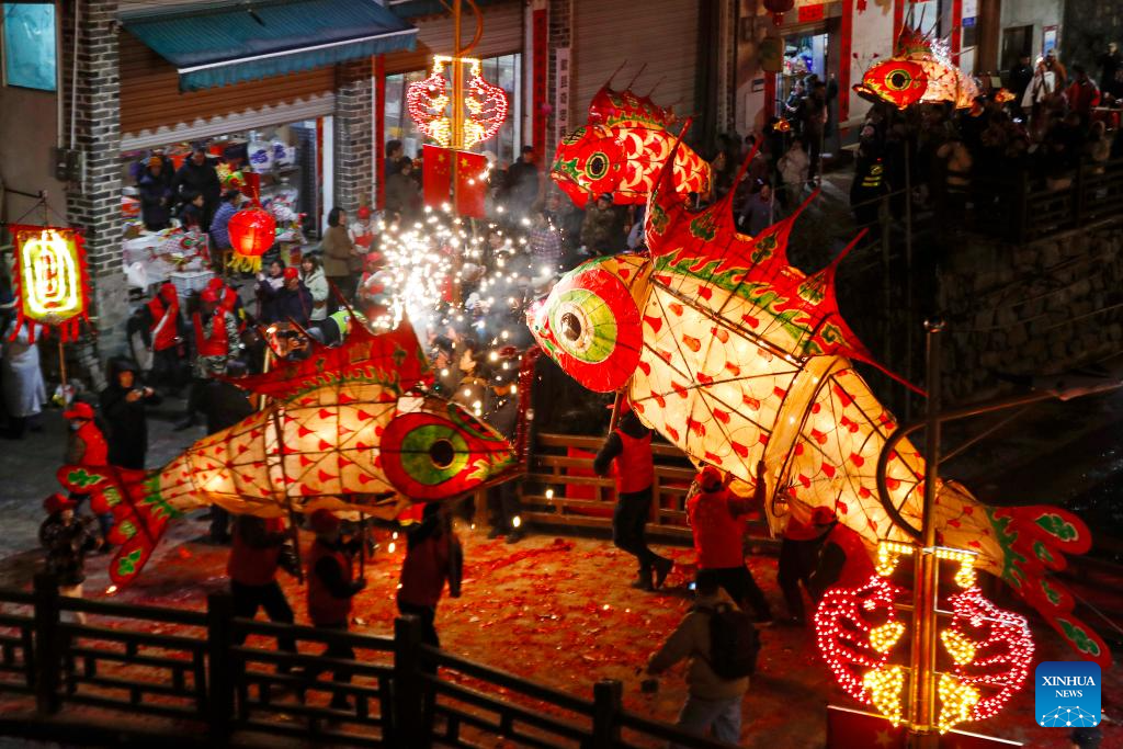 The fish-shaped lantern performing team patrol in Wangmantian Village, Shexian County of Huangshan City, east China's Anhui Province, Feb. 22, 2024. Local villagers have the tradition to make fish-shaped lanterns to pray for harvest and good fortune on the Lantern Festival, which falls on the 15th day of the first lunar month, or Feb. 24 this year. (Photo by Fan Chengzhu/Xinhua)