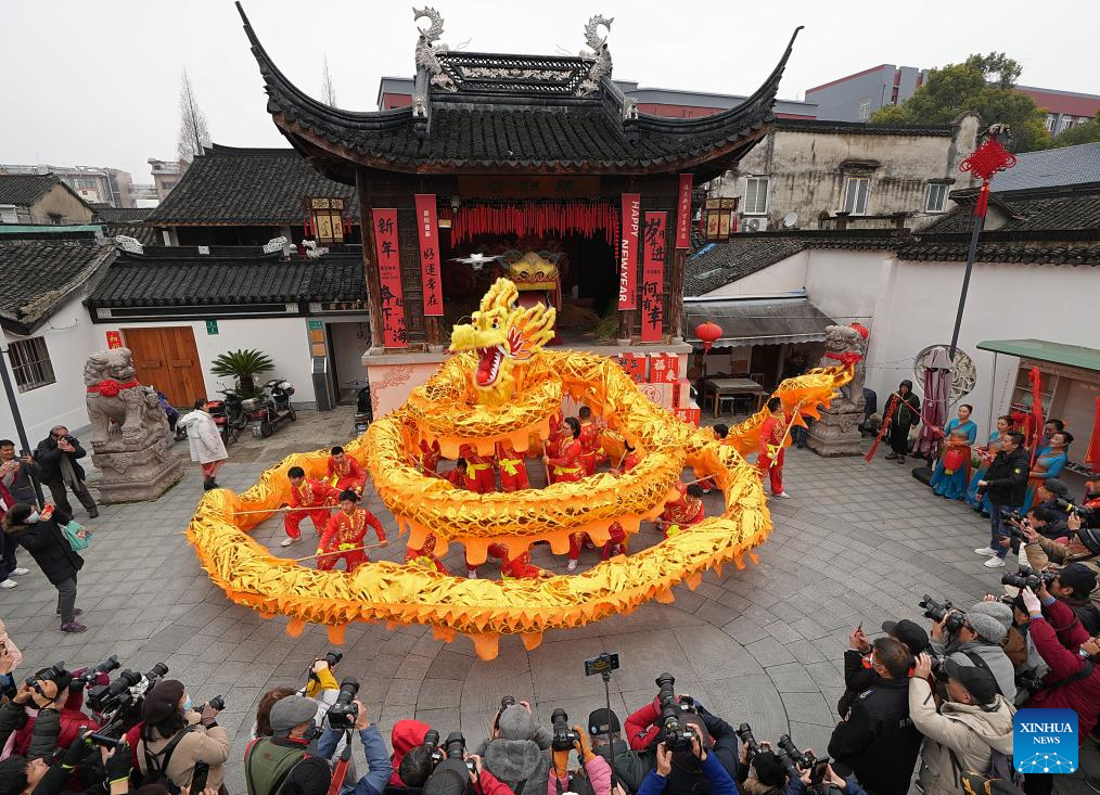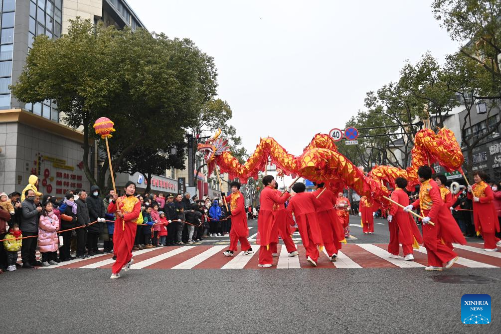 People perform a dragon dance in celebration of the upcoming Lantern Festival in Sanlin Town of Pudong New Area, east China's Shanghai Municipality, Feb. 23, 2024. Various activities to celebrate the Lantern Festival were held in Sanlin Town of Shanghai on Friday, attracting many visitors. The Lantern Festival falls on the 15th day of the first lunar month, or Feb. 24 this year. (Xinhua/Liu Ying)