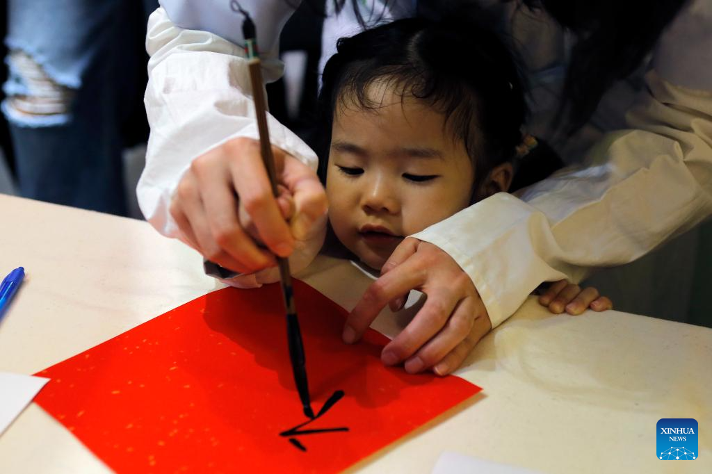 A child, with mother's help, tries Chinese calligraphy during an event celebrating the Lantern Festival at the Chinese Cultural Center in Bucharest, Romania, Feb. 23, 2024. (Photo by Cristian Cristel/Xinhua)