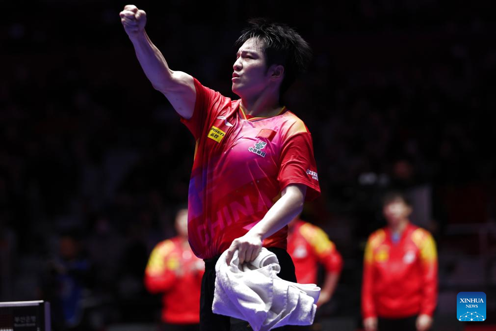 Fan Zhendong of China celebrates defeating Alexis Lebrun of France during the men's team final match between China and France at the ITTF World Team Table Tennis Championships Finals Busan 2024 in Busan, South Korea, Feb. 25, 2024. (Xinhua/Zhang Tao)