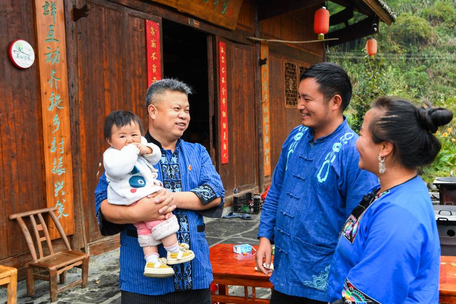 This file photo taken on Oct. 27, 2020 shows Long Xiulin (1st L) visiting the family of Long Xianlan in Shibadong Village of Xiangxi Tujia and Miao Autonomous Prefecture, central China's Hunan Province. (Xinhua/Chen Sihan)