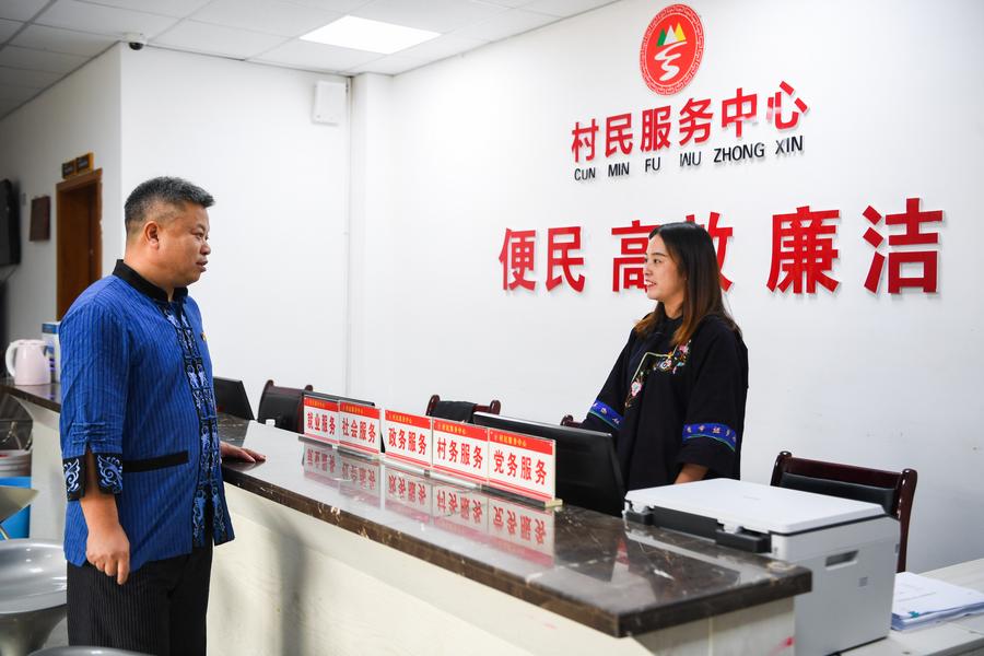 This file photo taken on Oct. 27, 2020 shows Long Xiulin (L) talking with Mei Yao, a village official, at the villager service center in Shibadong Village of Xiangxi Tujia and Miao Autonomous Prefecture, central China's Hunan Province. (Xinhua/Chen Sihan)