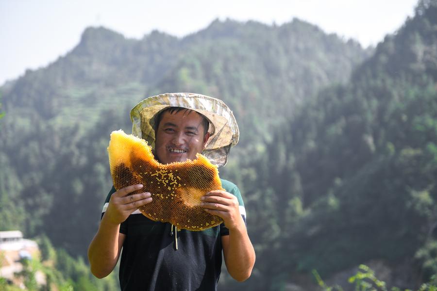 This file photo taken on Sept. 4, 2019 shows Long Xianlan holding a honeycomb in Shibadong Village of Xiangxi Tujia and Miao Autonomous Prefecture, central China's Hunan Province. (Xinhua/Chen Zeguo)