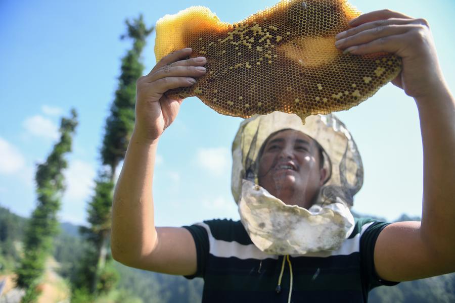 This file photo taken on Sept. 4, 2019 shows Long Xianlan checking a honeycomb in Shibadong Village of Xiangxi Tujia and Miao Autonomous Prefecture, central China's Hunan Province. (Xinhua/Chen Zeguo)